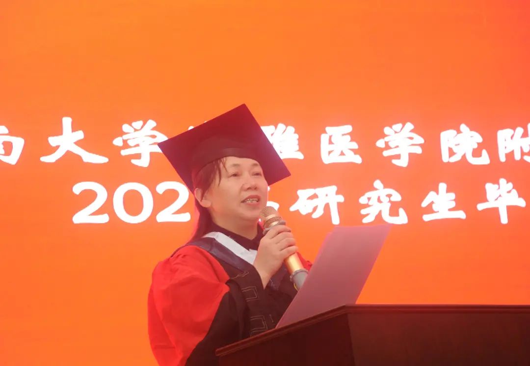 院长、博士生导师杨毅军教授致辞。他对2021届全体毕业生表示祝贺。他说,目前世界仍在遭受新冠疫情肆虐,更凸显了医学在人类生存和发展中的重要性,作为医学生应该也必须担负起国家富强、民族振兴、人民幸福的使命和责任。他嘱咐同学们铭记中南大学校训,践行湘雅校风,始终牢记自己是“中南人”“湘雅人”。他要求同学们人在哪里,中南风貌、湘雅精神、医者的责任和担当就在哪里。
