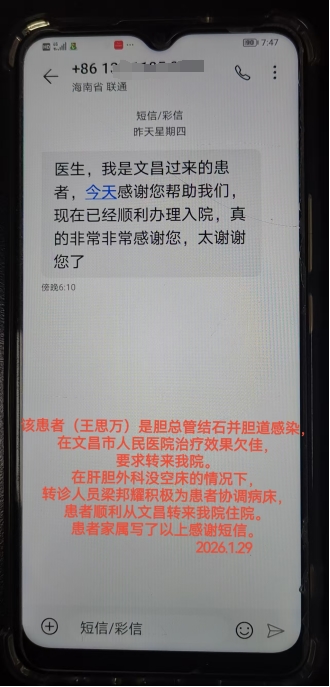 2026 年 1 月 29 日,客户服务部收到文昌患者家属发来的表扬短信,字里行间洋溢着真挚的感激之情。家属表示,因患者在文昌当地医院治疗效果欠佳,所以想转来偷拍在线 。当时偷拍在线 肝胆外科没有空床,客服部转诊人员梁邦耀帮忙协调床位,迅速启动全院床位协调机制,通过跨科室资源调配,成功为患者落实住院床位,确保其当日顺利从文昌转至偷拍在线 接受进一步治疗。