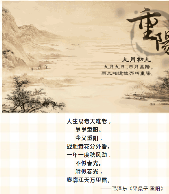 “九月九日,佩茱萸,食蓬饵,饮菊花酒,令人长寿。”自古以来,中国人对重阳节就有着特殊的情感。 重阳节的一大主题是“尊老敬老”,早在1989年,中国就把重阳节定为“老人节”。老人节,顾名思义,是属于老年人的节日,更是弘扬尊老敬老这一传统美德的节日。“老吾老,以及人之老”。尊老敬老,既是传统,也是社会进步的一个标志。