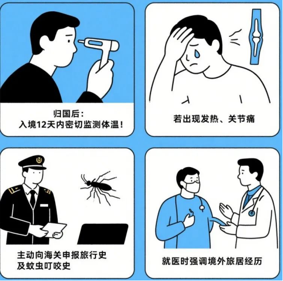 基孔肯雅热潜伏期为1-12天,归国人员在入境后12天内需主动做好自我健康监测,如出现发热、皮疹等症状,及时到医院就诊并主动告知医生近12天境外旅居史。