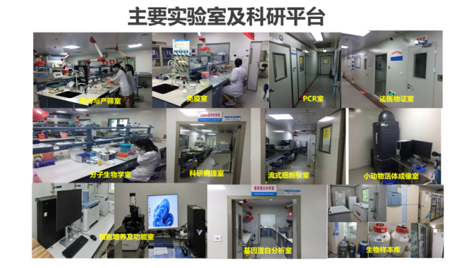 下设临床检测实验室、法医物证实验室、科学研究实验室及生物样本库;科室业务涉及临床、科研及教学。